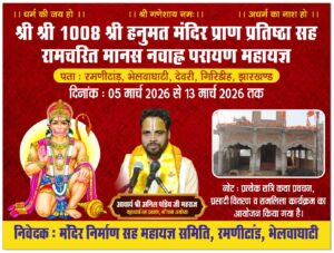 डीजे न्यूज, भेलवाघाटी(गिरिडीह) : धार्मिक आस्था और सनातन परंपरा के संगम के रूप में रमणीटांड़ भेलवाघाटी में 1008 श्री हनुमत मंदिर प्राण प्रतिष्ठा सह रामचरित मानस नवाह परायण महायज्ञ का भव्य आयोजन होने जा रहा है। इस अवसर पर कई दिनों तक चलने वाले धार्मिक अनुष्ठानों, कथा–प्रवचन और रामलीला के माध्यम से पूरा क्षेत्र भक्तिमय वातावरण में सराबोर रहेगा।