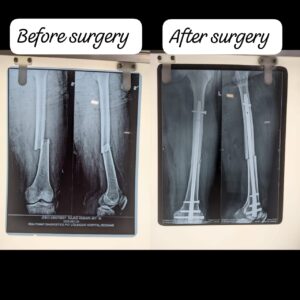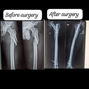 मरीज की जांघ की हड्डी में गंभीर फ्रैक्चर था। ऑपरेशन के दौरान प्लेट/रॉड प्रत्यारोपित कर हड्डी को स्थिर किया गया। आश्चर्यजनक रूप से मरीज ने ऑपरेशन के 24 घंटे के भीतर फिजियोथेरेपी शुरू कर दी और चलना भी आरंभ कर दिया।