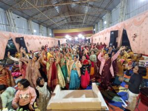 कथा के बीच-बीच में सुमधुर भजनों ने माहौल को और भी उत्सवी बना दिया। जब व्यास जी ने “मीठे रस से भरों री राधा रानी लागे महारानी लागे, मने कारो कारो यमुना जी रो पानी लागे…” और “राधे-राधे, राधे-राधे…” का संकीर्तन किया, तो श्रद्धालु अपनी जगह पर खड़े होकर झूमने और नाचने लगे।