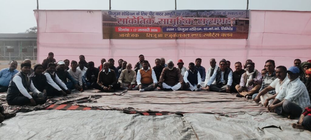 सामूहिक सत्याग्रह पर बैठे जोगता के नागरिक सिजुआ स्टेडियम की रखरखाव और माली को बकाया वेतन देने की है मांग