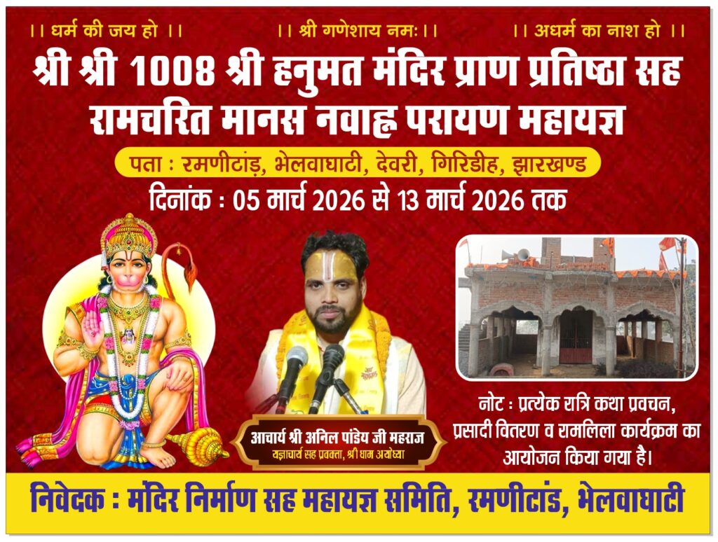 भेलवाघाटी में हनुमत मंदिर प्राण प्रतिष्ठा सह रामचरित मानस नवाह परायण महायज्ञ का होगा भव्य आयोजन पांच मार्च को कलश