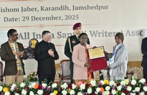 डीजे न्यूज, जमशेदपुर : करनडीह — दिशोम जाहेर परिसर में आयोजित 22वां संताली “परसी महा” एवं ओलचिकी लिपि के शताब्दी वर्ष समापन समारोह में सोमवार को राष्ट्रपति द्रौपदी मुर्मु मुख्य अतिथि के रूप में शामिल हुईं। कार्यक्रम में राज्यपाल संतोष कुमार गंगवार और मुख्यमंत्री हेमंत सोरेन विशिष्ट अतिथि के तौर पर मौजूद रहे।