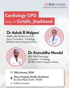 मर्सी हॉस्पिटल, गिरिडीह में शनिवार को विशेष कार्डियोलॉजी ओपीडी का आयोजन किया गया है। इस अवसर पर कोलकाता के वरिष्ठ हृदय रोग विशेषज्ञ डॉ. अशोक बी. मलपानी अपनी सेवाएं देंगे।