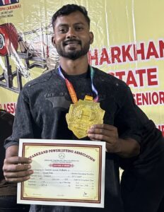 डीजे न्यूज, बलियापुर(धनबाद):झारखंड पावरलिफ्टिंग संगठन द्वारा बोकारो में रविवार को आयोजित बेंच प्रेस झारखंड पावरलिफ्टिंग चैंपियनशिप में बलियापुर के खिलाड़ी संतोष कुमार महतो ने 110 किलो भार प्रतियोगिता में प्रथम स्थान प्राप्त कर स्वर्ण पदक हासिल किया है। उनके इस सफलता से बलियापुर के खिलाड़ी एवं खेल प्रेमियों में हर्ष है। स्वर्ण पदक हासिल करने वाला खिलाड़ी संतोष कुमार महतो बलियापुर निवासी दिलीप कुमार महतो व कुसुम देवी का पुत्र है । उनके पिता वाहन चालक एवं माता ग्रहणी है। संतोष करीब 6 महीने से बलियापुर स्थित द ड्रीम फिजिक संस्थान में पावरलिफ्टिंग का प्रैक्टिस करता है। पहली अवसर में ही स्वर्ण पदक हासिल करने से वह काफी गौरव महसूस कर रहा है । उन्होंने अपनी इस सफलता से अपने माता-पिता एवं परिवार के साथ-साथ बलियापुर का नाम रोशन किया है। सिंदरी के विधायक चंद्रदेव महतो, पूर्व विधायक आनंद महतो, भाजपा नेत्री तारा देवी, घनश्याम ग्रोवर, जगदीश प्रसाद अग्रवाल, आशीष चटर्जी, मुखिया गणेश महतो , विजय गोराय आदि ने बधाई दी है।