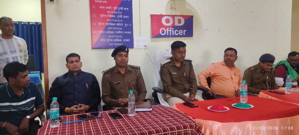 डीजे न्यूज, पूर्वी टुंडी(धनबाद) : होली त्योहार और रमजान माह को लेकर शनिवार को पूर्वी टुंडी थाना परिसर में शनिवार को शांति समिति की बैठक आयोजित की गई। बैठक की अध्यक्षता थाना प्रभारी नीतीश कुमार ने किया। बैठक में होली त्योहार एवं रमजान माह पर शांति व्यवस्था बनाए रखने को लेकर उपस्थित जनप्रतिनिधियों एवं समाजसेवियों के साथ चर्चा की गई। थाना प्रभारी व पुलिस इंस्पेक्टर साजिद हुसैन ने क्षेत्र के लोगों से आपसी सौहार्दपूर्ण माहौल एवं शांति के साथ त्योहार मनाएं जाने की अपील की। क्षेत्र के जनप्रतिनिधि समेत समाज के प्रमुख लोगों से माहौल पर नजर बनाए रखने के साथ-साथ असामाजिक तत्व जो शांतिपूर्ण माहौल को बिगाड़ सकते हैं, वैसे लोगों पर नजर रखने की अपील की गई। प्रशासन द्वारा डीजे बजाने और अश्लील गाना बजाने वालों पर विशेष निगरानी रखने की बात की गई। साथ ही बच्चा चोरी की अफवाह फैलाने वालों पर कानूनी कार्रवाई की चेतावनी दी गई।